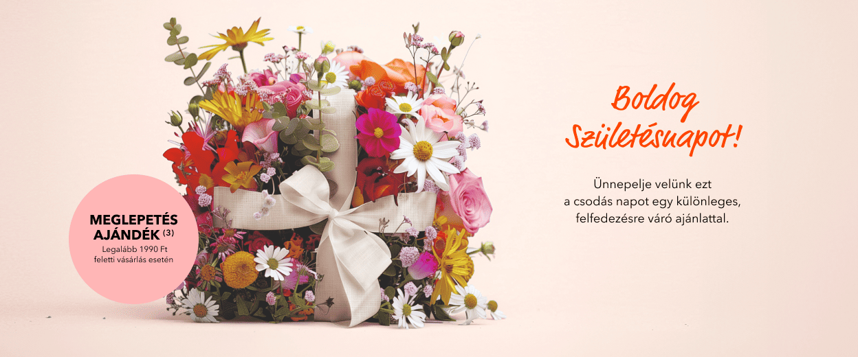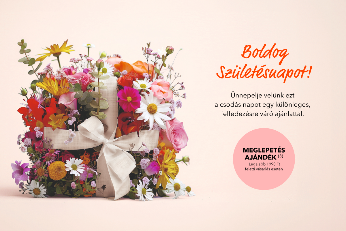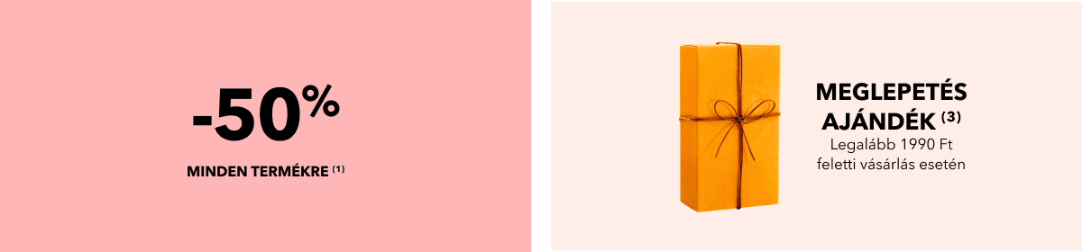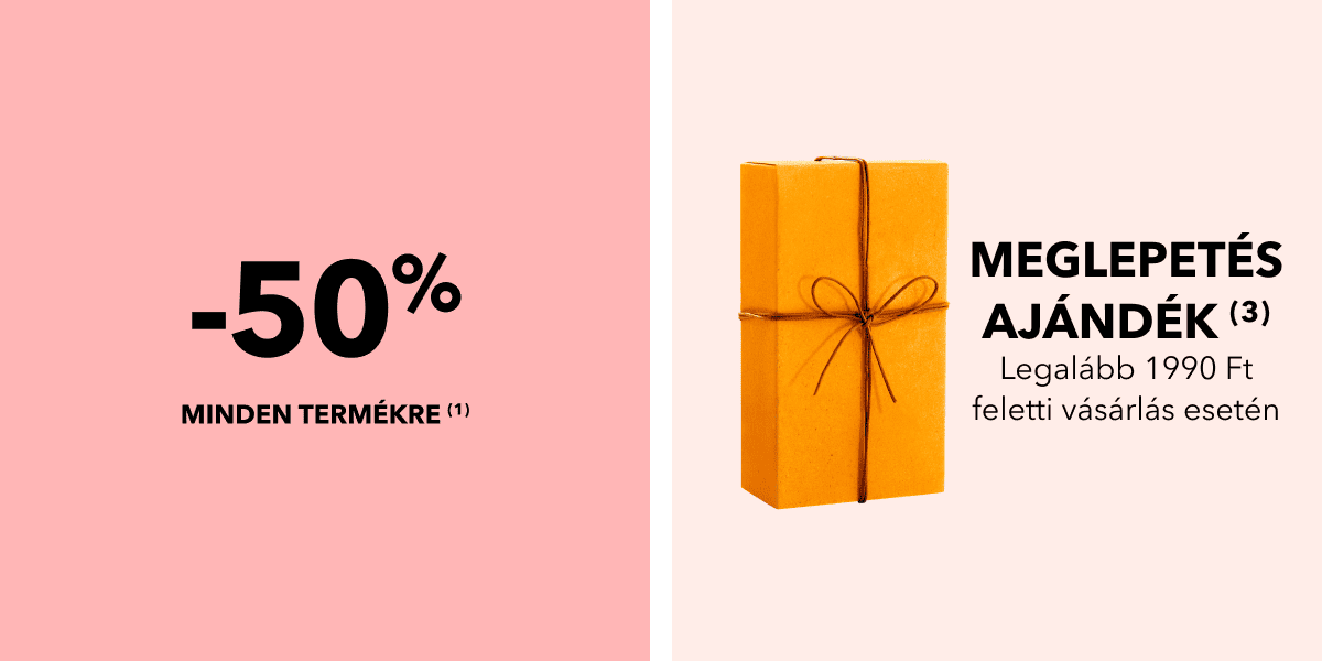 (3) Vásárlónként 1 db meglepetés ajándék adható legalább 1990 Ft feletti szépségápolási termék vásárlása esetén vásárlónként egy alkalommal. Az ajánlat a készlet erejéig érvényes. Az ajánlat csak egy alkalommal használható fel. Az ajánlat más kedvezményekkel nem összevonható. A feltüntetett termékárak változtatásának jogát fenntartjuk. A feltüntetett termékárak (pl.: Ft/ml) matematikailag kerekítésre kerültek.
