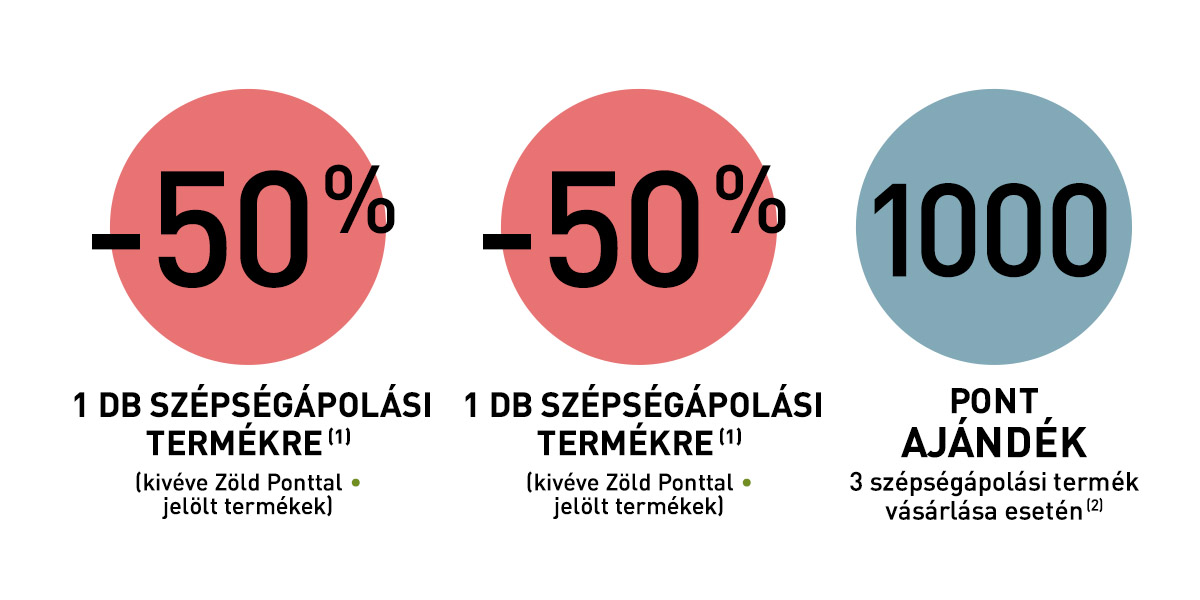 *Az ajándék arctisztító korong legalább 1490 Ft feletti szépségápolási termék vásárlása esetén adható vásárlónként egy alkalommal a készlet erejéig, vagy az 1490 Ft feletti vásárlás esetén járó arctisztító korong helyett ajándék 500 törzsvásárlói pont kérhető, melyet a vásárlás után írunk jóvá. Az ajánlat más kedvezményekkel nem összevonható.