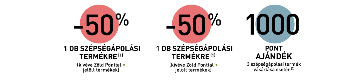(2) Ajándék 1000 törzsvásárlói pont legalább 3 db Ön által választott szépségápolási termék vásárlása esetén vásárlónként egy alkalommal. Más ajánlattal nem összevonható.