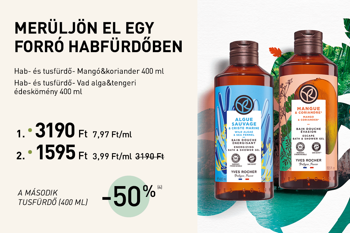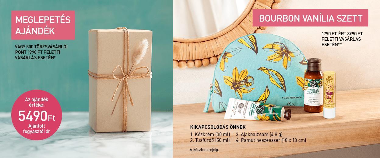 (2) Az Yves Rocher Hungary Kft. által ajánlott eredeti, nem akciós fogyasztói árakból. Az ajánlat más kedvezményekkel nem összevonható és nem vonatkozik a Zöld Ponttal jelölt termékekre.