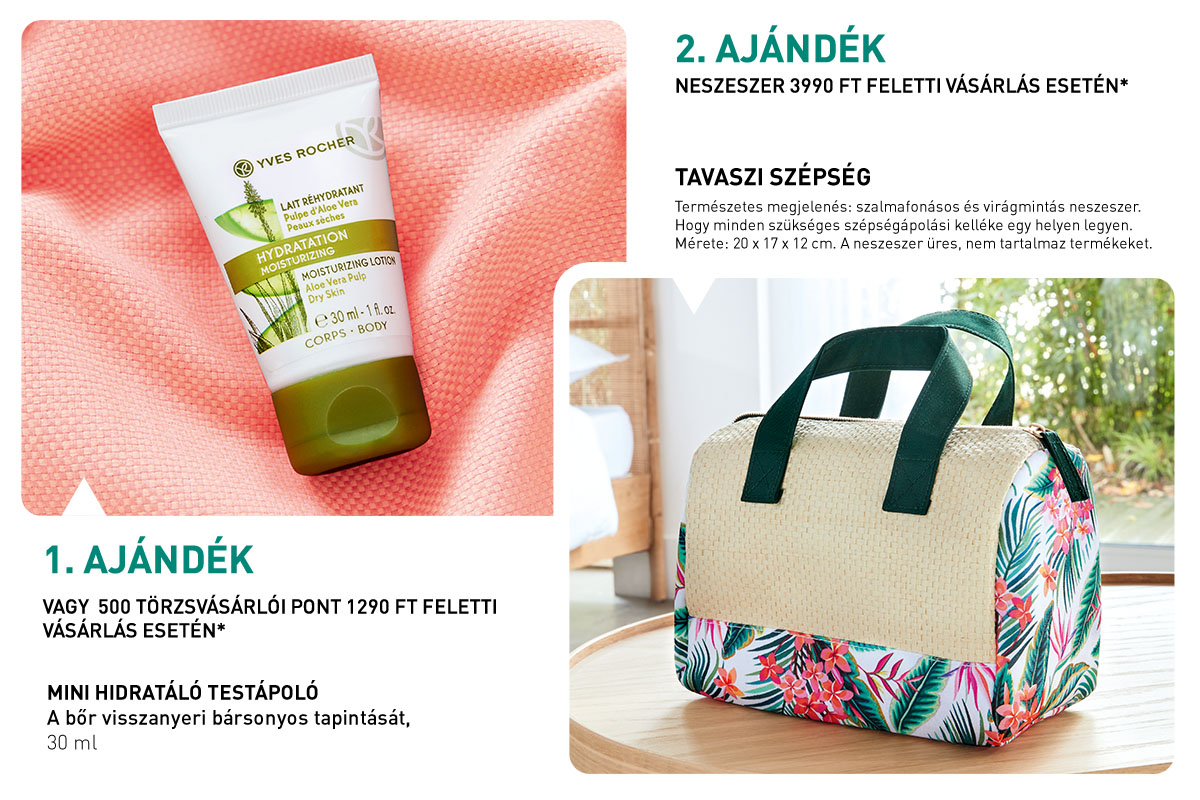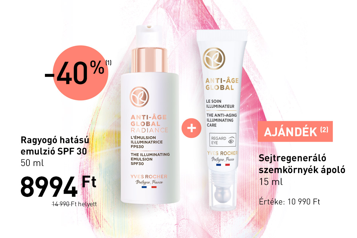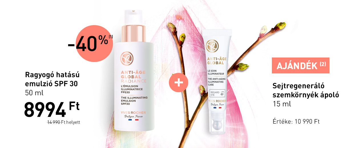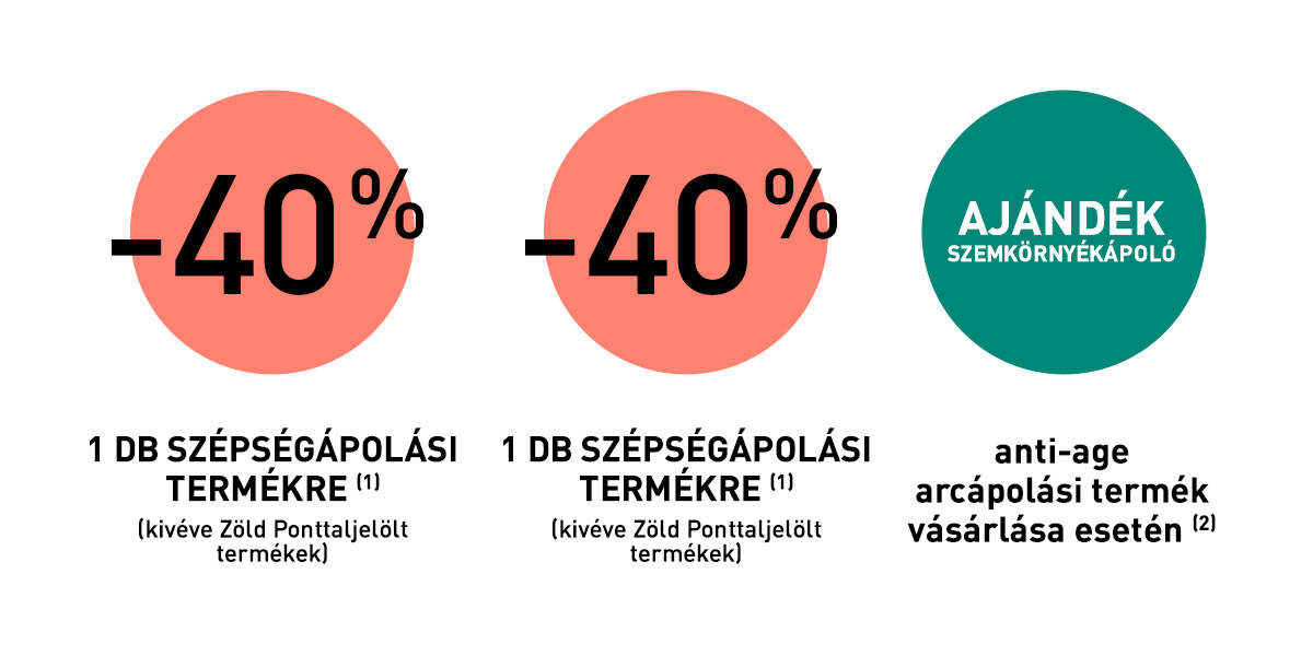 (1)-40 % kedvezmény 1 db szépségápolási termékre. Az Yves Rocher Hungary Kft. által ajánlott eredeti, nem akciós fogyasztói árakból. Az ajánlat más kedvezményekkel nem összevonható és nem vonatkozik a Zöld Ponttal jelölt termékekre.