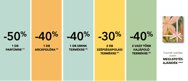 (1) Bármely 1 db parfüm termék alapár szerinti vásárlása esetén egy alkalommal a vásárló 50% kedvezményt kap.