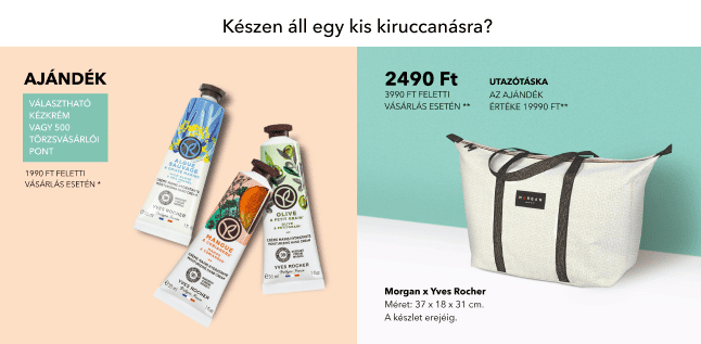 *Választható Kézkrém Mangó & Koriander vagy Vad Alga & Tengeri Édeskömény vagy Olíva & Keserűnarancs illatban 1990 Ft feletti szépségápolási termék vásárlása esetén vásárlónként egy alkalommal a készlet erejéig, vagy 500 törzsvásárlói pont kérhető. Az Yves Rocher Hungary Kft. által ajánlott eredeti, nem akciós fogyasztói árakból számítva. Az ajánlat más kedvezményekkel nem összevonható, nem vonatkozik csomagokra, ajándékutalványokra és mini termékekre.