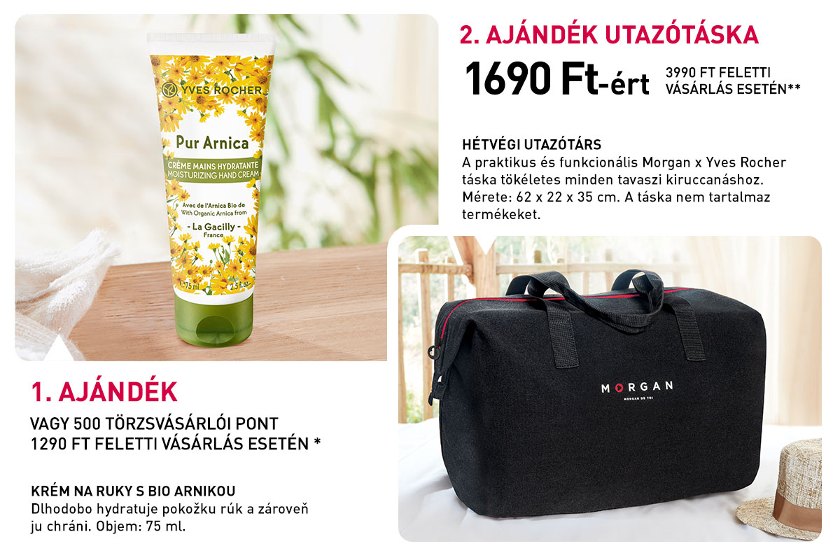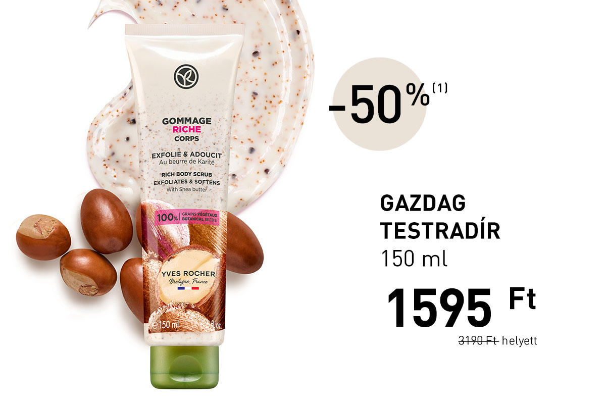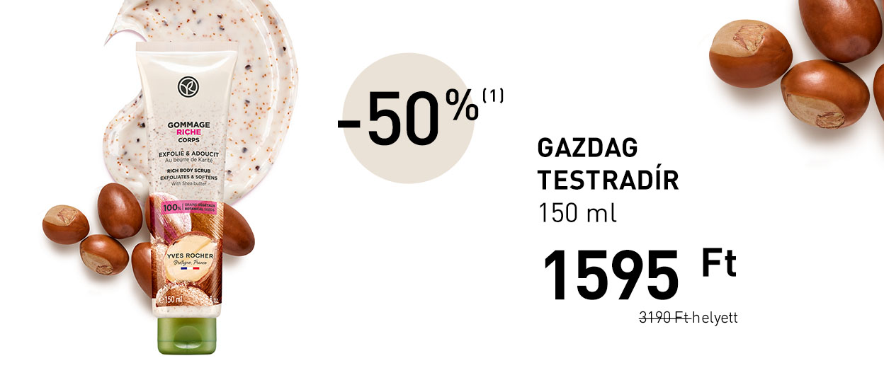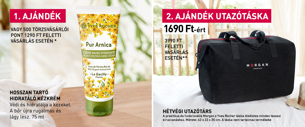 Az ajánlatok a készlet erejéig érvényesek, ajándékot csak egyszer adunk ki. Az ajánlat a magyarországi Yves Rocher márkaboltokban és a www.yves-rocher.hu webáruházban 2022.04.30-ig érvényes. Az ajánlat más kedvezményekkel nem vonható össze és nem kombinálható. Az összes kedvezményt a magyarországi 2022-es alapárakból (kedvezmény előtti ár) számítjuk ki. Kérjük, a megrendelés visszaigazolása előtt ellenőrizze, hogy a kedvezmény érvényesítésre került-e. Ellenkező esetben az akció nem érvényes. A képeslap ajánlatának igénybevételekor a webáruház kínálatából már nem lehet ajándékot választani. A képeslap ajánlatra hűségkedvezmény nem érvényesíthető. A vásárlásért járó pontokat a vásárlás után írjuk jóvá, és a következő vásárlás alkalmával lehet felhasználni. A feltüntetett termékárak változtatásának jogát fenntartjuk. A feltüntetett termékárak (pl.: Ft/ml) matematikailag kerekítésre kerültek. A képeslap ajánlatai törzsvásárlói kártyával és névre szóló képeslappal együtt érvényesek, utólag nem érvényesíthetők. Nyomtatási hibákért nem vállalunk felelősséget.