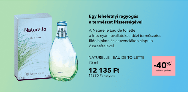 (1) Az Yves Rocher Hungary Kft. által ajánlott eredeti, nem akciós fogyasztói árakból. Az ajánlat más kedvezményekkel nem összevonható, nem vonatkozik csomagokra, csomagolóanyagokra, adventi kalendáriumra és ajándékutalványra.