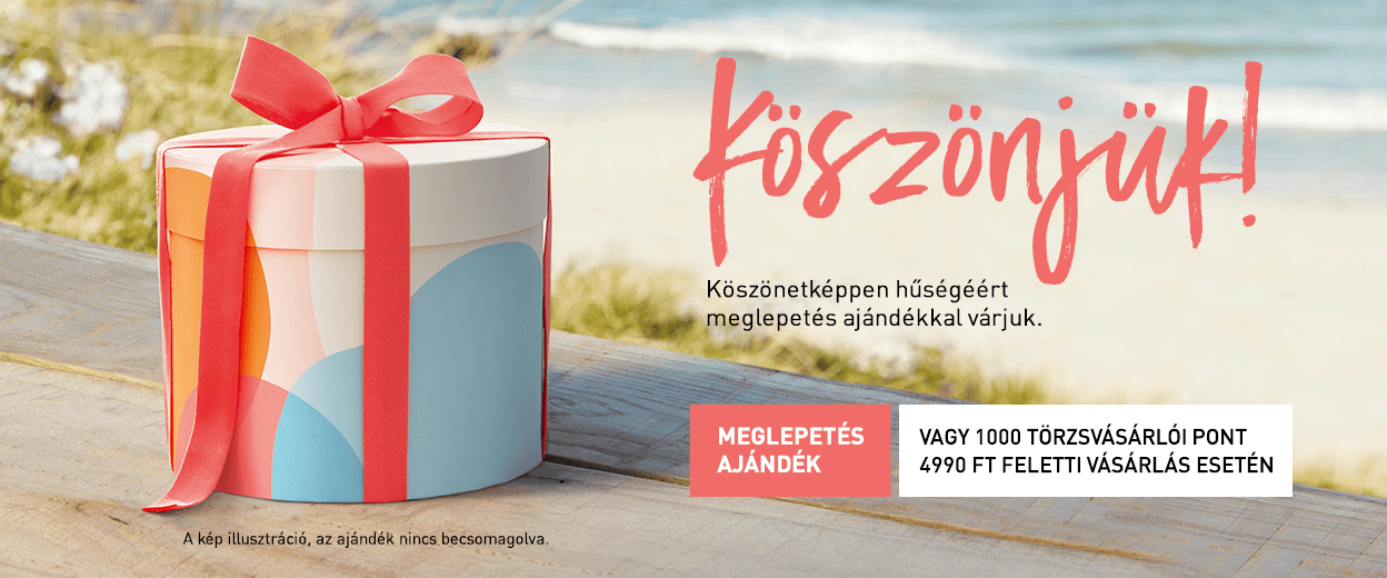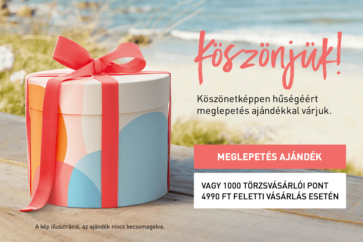 *A meglepetés ajándék legalább 4990 Ft feletti szépségápolási termék vásárlása esetén adható vásárlónként egy alkalommal a készlet erejéig, vagy a 4990 Ft feletti vásárlás esetén járó meglepetés ajándék helyett ajándék 1000 törzsvásárlói pont kérhető, melyet a vásárlás után írunk jóvá. Az ajánlat más kedvezményekkel nem összevonható.