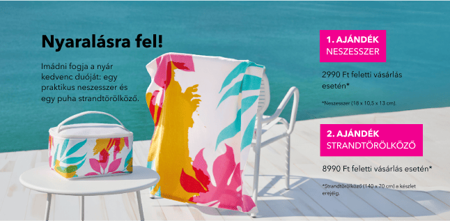 *Az ajándék neszesszer 2990 Ft feletti, a strandtörölköző 8990 Ft feletti szépségápolási termék vásárlása esetén adható vásárlónként egy alkalommal a készlet erejéig. Az ajánlat más kedvezményekkel nem összevonható.
