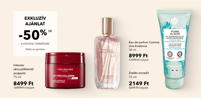 (2) Az Yves Rocher Hungary Kft. által ajánlott eredeti, nem akciós fogyasztói árakból. Az ajánlat más kedvezményekkel nem összevonható, nem vonatkozik csomagokra, csomagolóanyagokra, adventi kalendáriumra és ajándékutalványra.