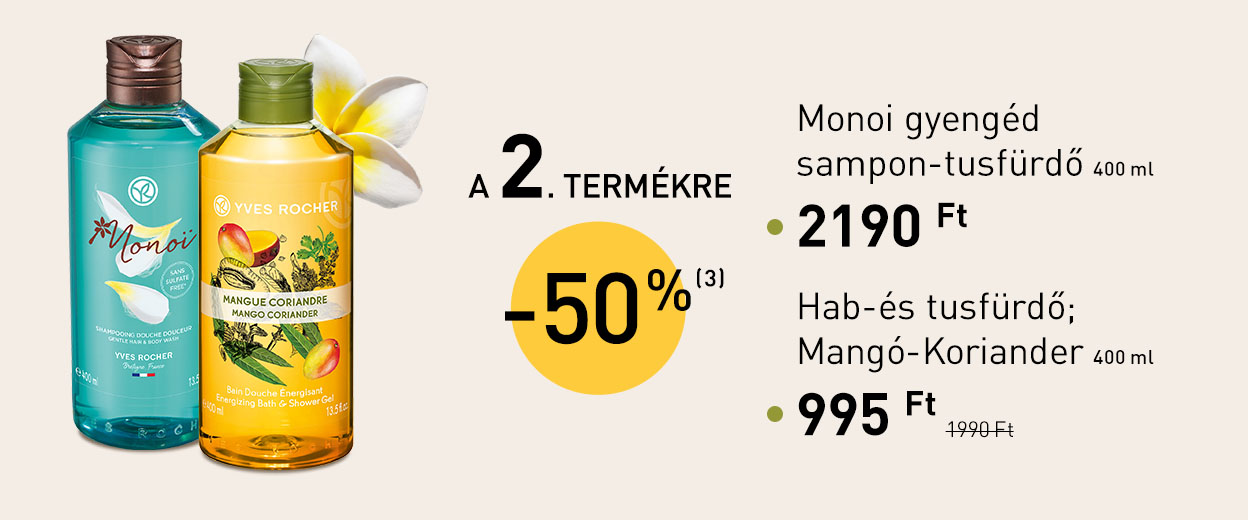 (3) Más ajánlatokkal nem összevonható. Az ajánlat a 400 ml-es PLAISIRS NATURE (többféle illatú) tusfürdőkre és a 400 ml-es MONOI sampon-tusfürdőre érvényes. A kedvezmény a második alacsonyabb vagy azonos árú termékre vonatkozik.