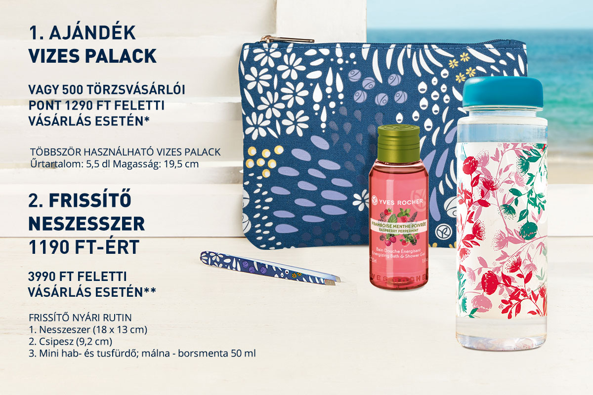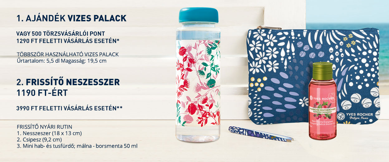 *Az ajándék vizes palack legalább 1290 Ft feletti szépségápolási termék vásárlása esetén adható vásárlónként egy alkalommal a készlet erejéig, vagy az 1290 Ft feletti vásárlás esetén járó vizes palack helyett ajándék 500 törzsvásárlói pont kérhető, melyet a vásárlás után írunk jóvá. Az ajánlat más kedvezményekkel nem összevonható.