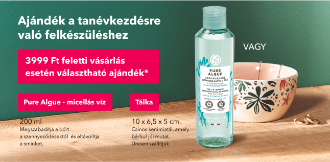 *3999 Ft feletti vásárlás esetén választható micellás víz vagy tálka ajándékba vásárlónként egy alkalommal a készlet erejéig. Az ajánlat más kedvezményekkel nem összevonható.