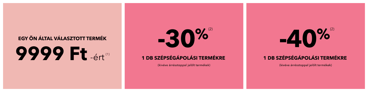 (1) Egy db Ön által választott szépségápolási terméket 9999 Ft-ért vásárolhat meg az ajánlott eredeti fogyasztói ár helyett. Az ajánlat más kedvezményekkel nem összevonható, nem vonatkozik csomagokra, csomagolóanyagokra, adventi kalendáriumra és ajándékutalványra.