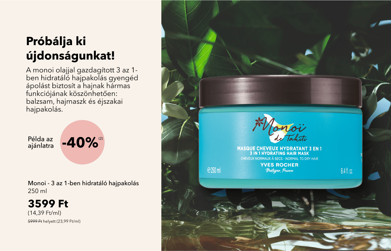 (2) Az Yves Rocher által ajánlott eredeti, nem akciós fogyasztói árakból. Az ajánlat más kedvezményekkel nem összevonható, nem vonatkozik csomagokra, csomagolóanyagokra, adventi kalendáriumra és ajándékutalványra.