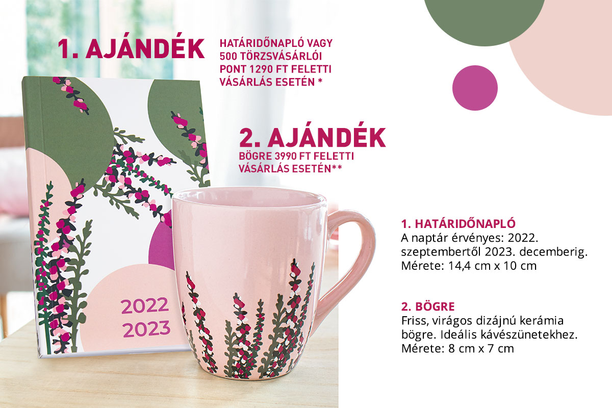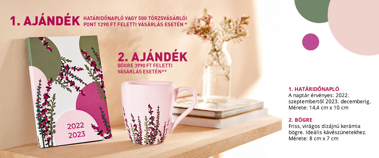 *Az ajándék határidőnapló legalább 1290 Ft feletti szépségápolási termék vásárlása esetén adható vásárlónként egy alkalommal a készlet erejéig, vagy az 1290 Ft feletti vásárlás esetén járó határidőnapló helyett ajándék 500 törzsvásárlói pont kérhető, melyet a vásárlás után írunk jóvá. Az ajánlat más kedvezményekkel nem összevonható.