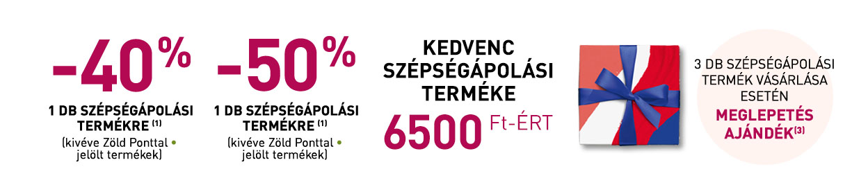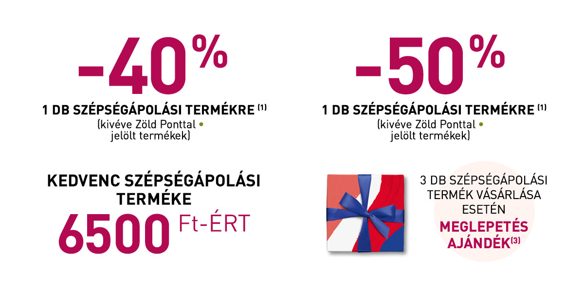 (2) Bármely Ön által választott szépségápolási termék 6500 Ft-ért vásárolható meg. Más ajánlattal nem összevonható. Nem érvényes a csomagokra, ajándékutalványokra és a Zöld Ponttal jelölt termékekre.