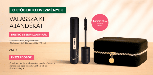 *4999 Ft feletti vásárlás esetén választható szempillaspirál vagy ékszerdoboz ajándékba vásárlónként egy alkalommal a készlet erejéig. Az ajánlat más kedvezményekkel nem összevonható.