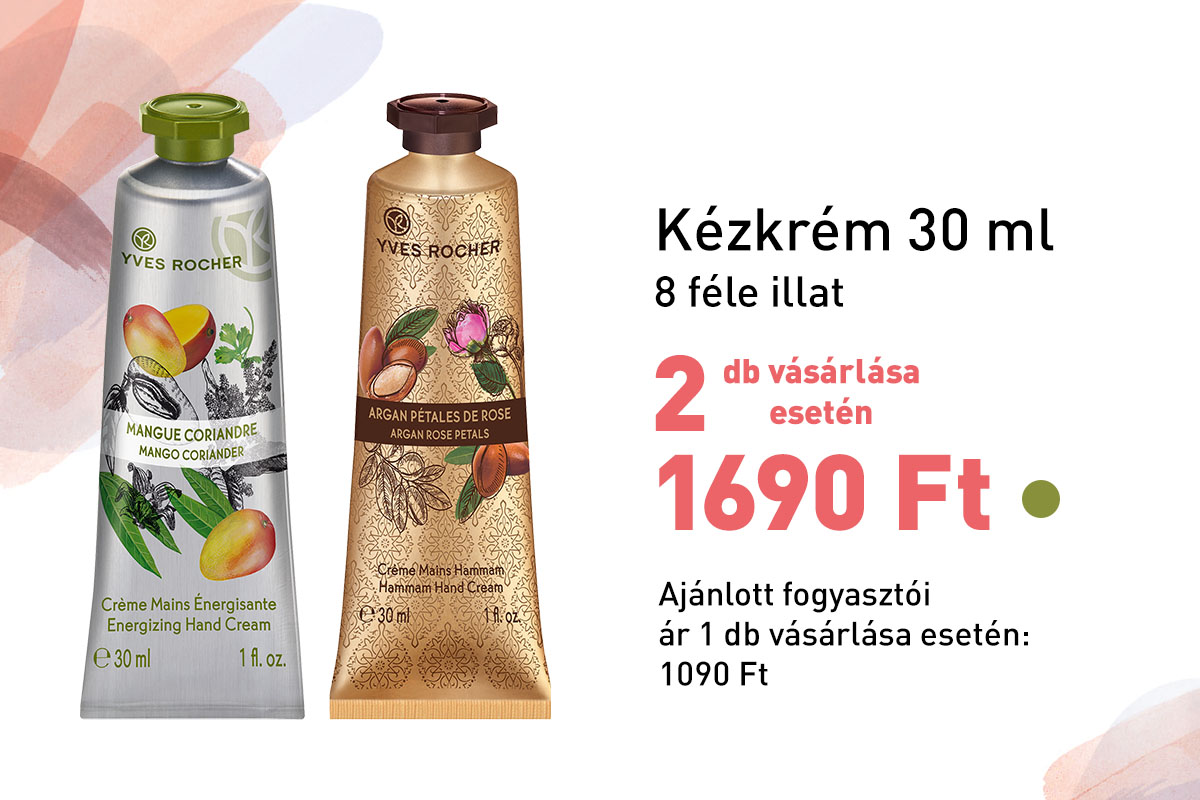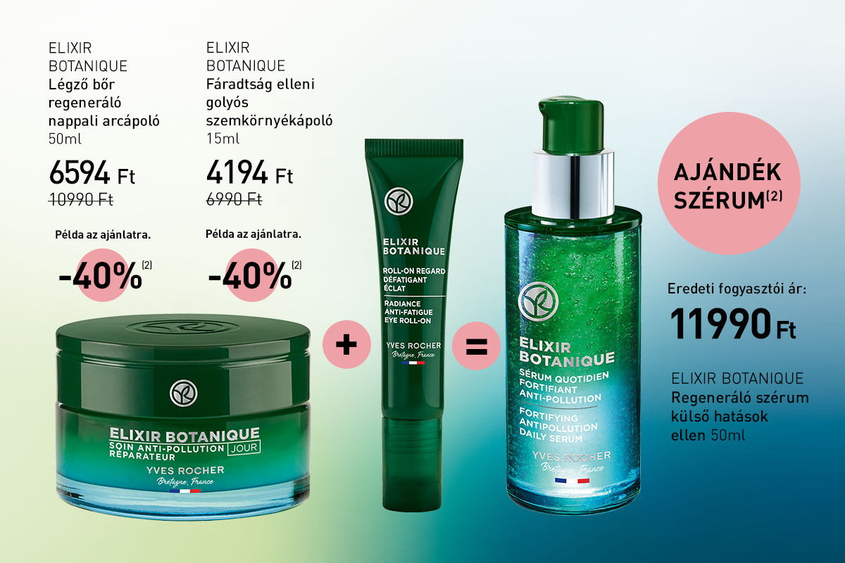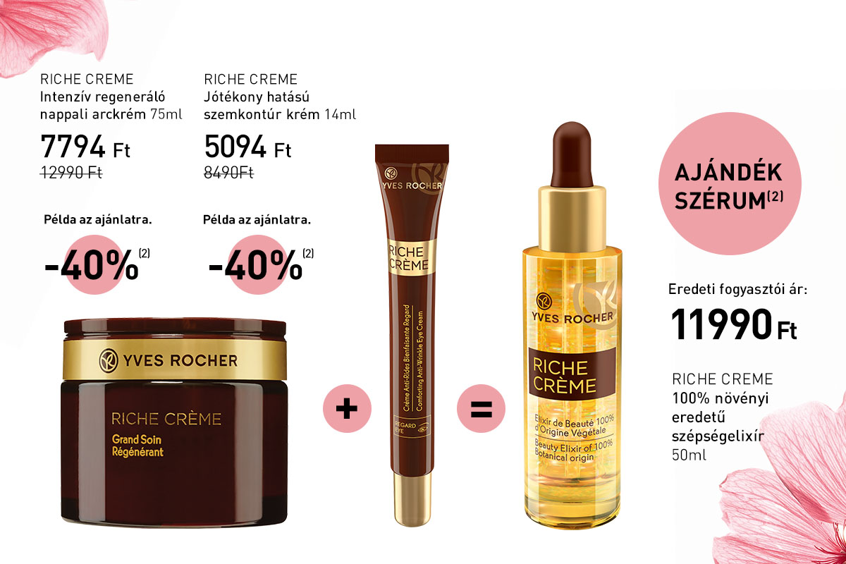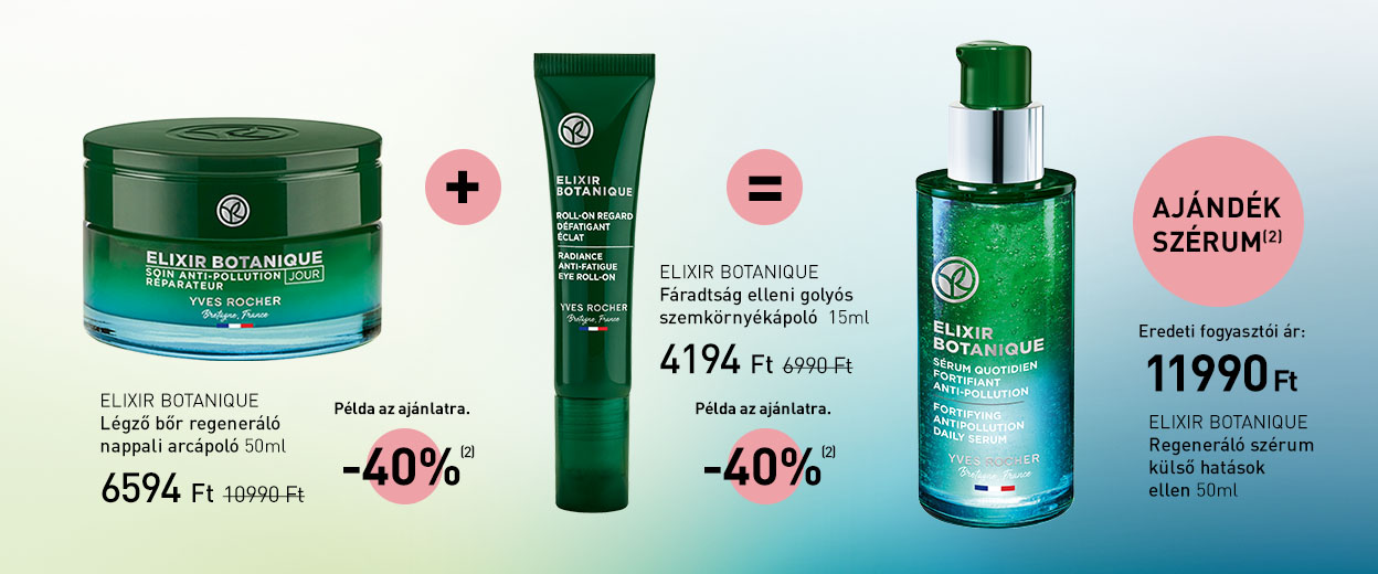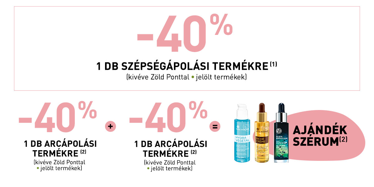 (1) Az Yves Rocher Hungary Kft. által ajánlott eredeti, nem akciós fogyasztói árakból. Az ajánlat más kedvezményekkel nem összevonható és nem vonatkozik a Zöld Ponttal jelölt termékekre.