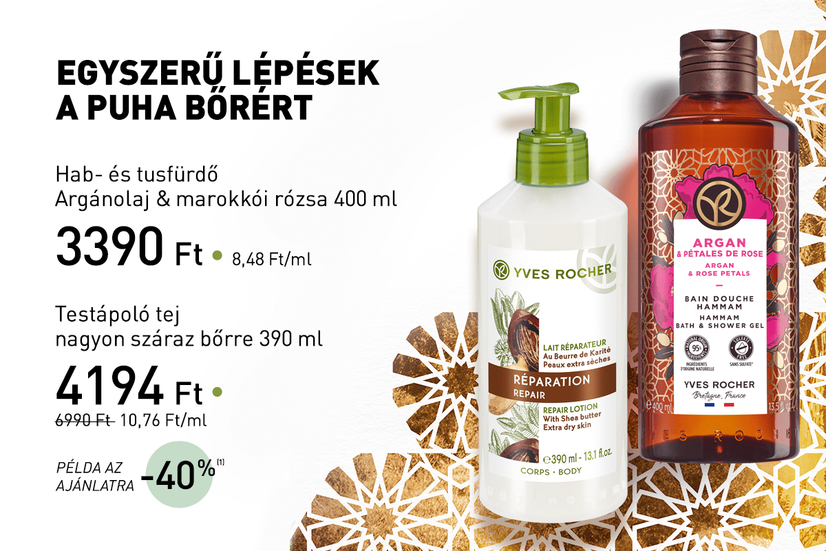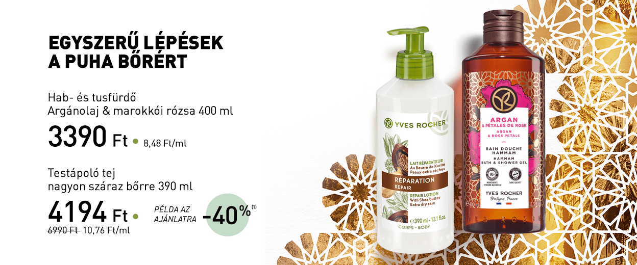 (1) Az Yves Rocher Hungary Kft. által ajánlott eredeti, nem akciós fogyasztói árakból. Az ajánlat más kedvezmények- kel nem összevonható és nem vonatkozik a Zöld Ponttal jelölt termékekre.