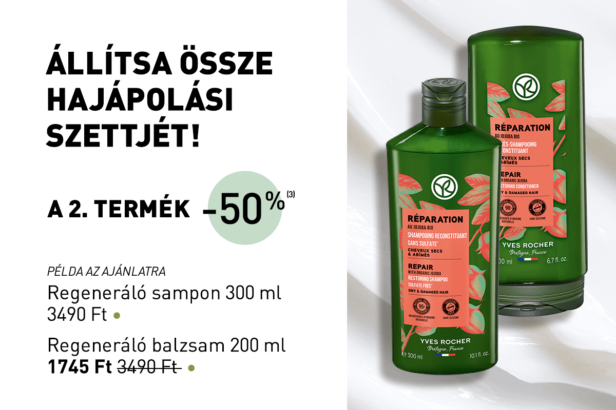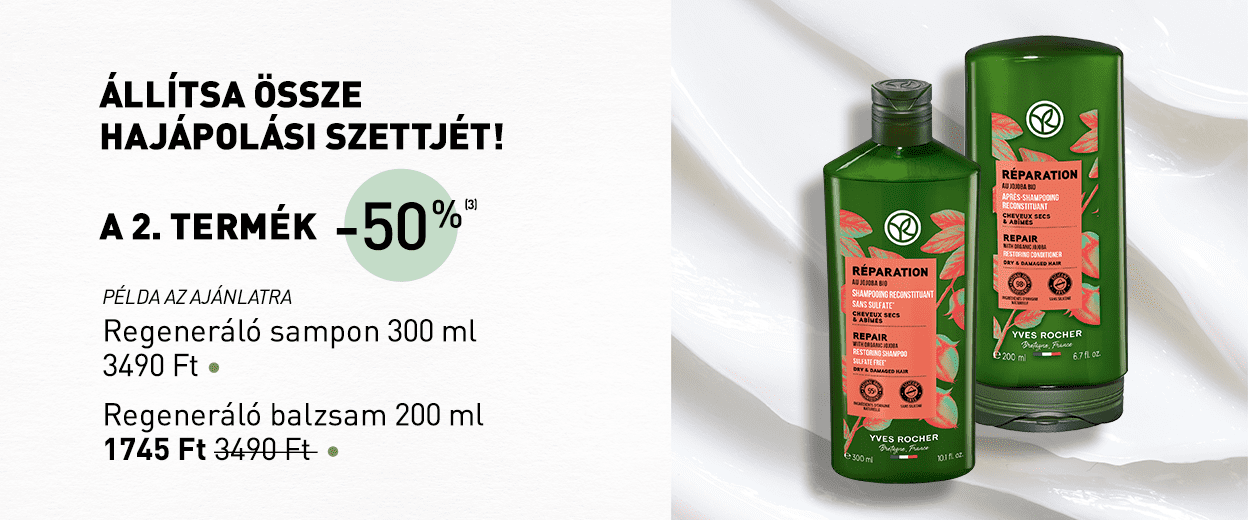 (3) Az ajánlat a Növényi Hajápolás Samponjaira és Balzsamjaira vonatkozik. 50% kedvezmény a második alacsonyabb vagy azonos árú termékre (sampon vagy balzsam). Az ajánlat más kedvezményekkel nem összevonható.