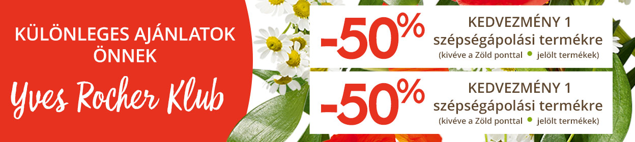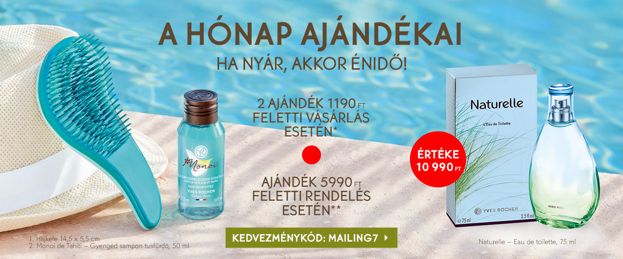1190 Ft feletti vásárlás esetén Hajkefe és Monoi de Tahiti – Gyengéd sampon tusfürdő, 50 ml ingyen, 5990 Ft feletti rendelés esetén Naturelle – Eau de toilette, 75 ml ingyen. A -50%-os kedvezmények 1 db szépségápolási termékre érvényesek és minden esetben az eredeti, nem akciós fogyasztói árból kerülnek levonásra. Outlet termékek, csomagok és Zöld Ponttal jelölt termékek vásárlása esetén a kedvezménykód nem vehető igénybe. Az ajánlat 2020. júl. 31-ig érvényes a www.yves-rocher.hu webáruházban és a márkaboltokban. Egy rendelés keretén belül csupán egy kedvezménykód alkalmazható, és nem kombinálható más akciós ajánlattal.