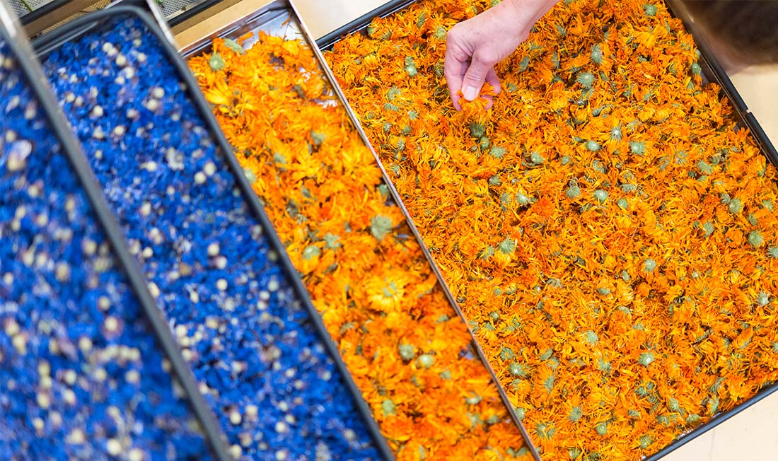 Minden növény a saját tempójában növekszik, így a betakarításra május és augusztus között kerül sor. Az orvosi kamilla május elején virágzik, így ezt május közepén aratjuk le. A búzavirágot és a körömvirágot június elején takarítjuk be.