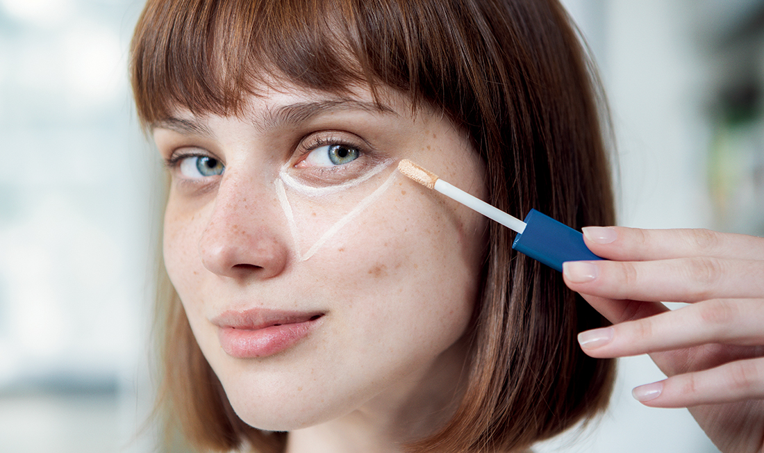 - Az applikátor segítségével közvetlenül a szem alá vidd fel a korrektort, fordított háromszöget formálva.
