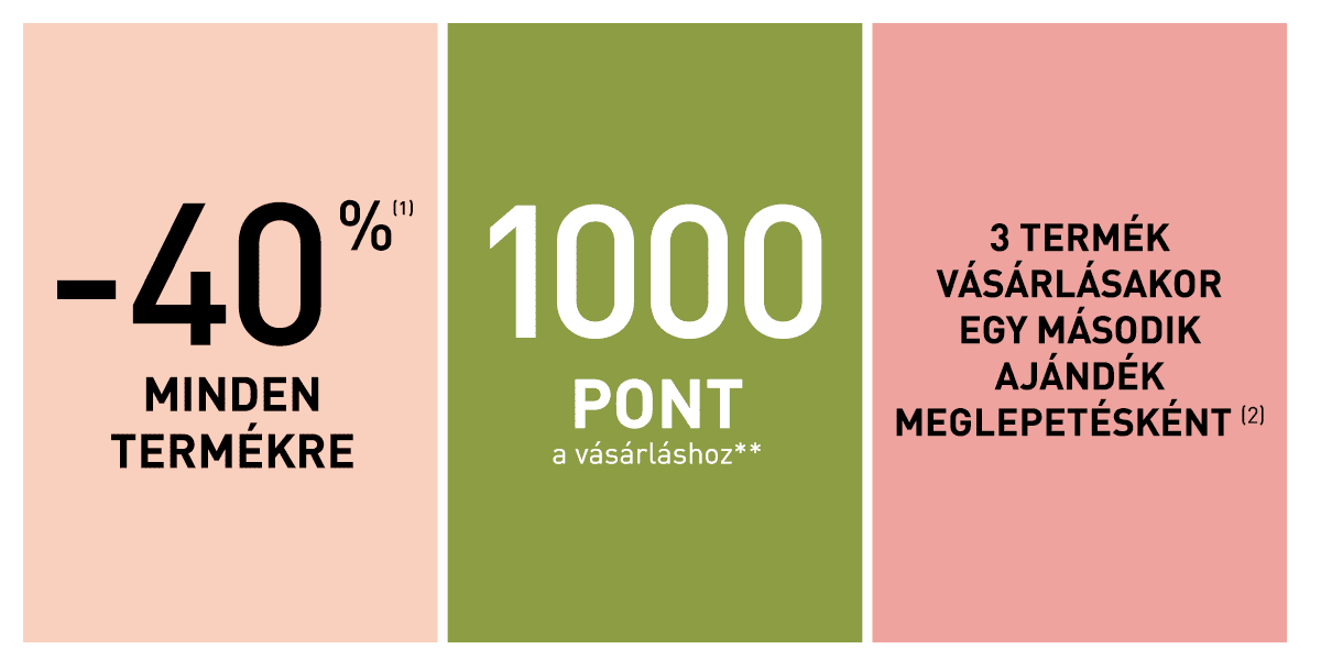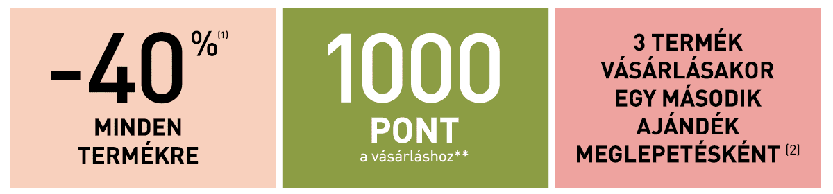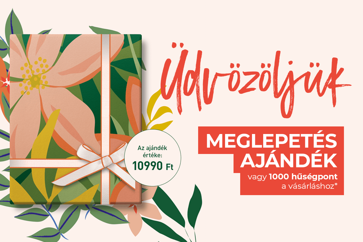 *A kedvezmények és ajánlatok nem halmozhatók fel és nem összevonhatók. Egy ajándék meglepetésként vagy 1000 hűségpont vásárlónként 1990 Ft feletti vásárlás esetén. Az ajánlat a készlet erejéig érvényes. Az ajándék változhat.